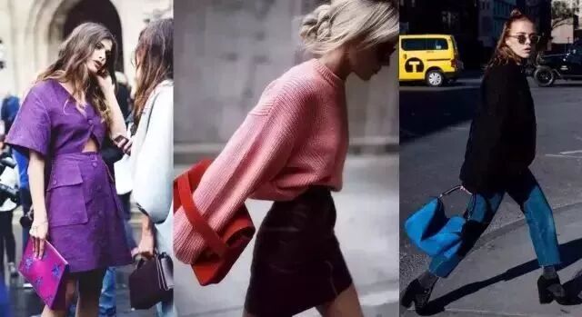 黑白灰都是我们平时衣橱里最多的颜色,当你穿这些中性色的打扮时,不妨选择一些色彩强烈的包包做点缀色。