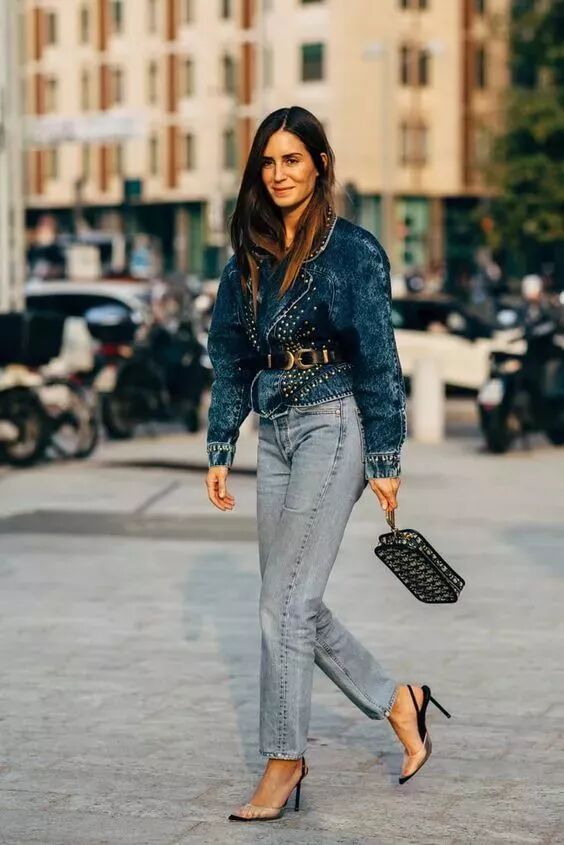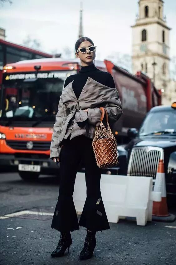 由于喇叭裤的廓形感,上半身的搭配尽量选择修身或者短小的单品,这样才能穿出好比例。