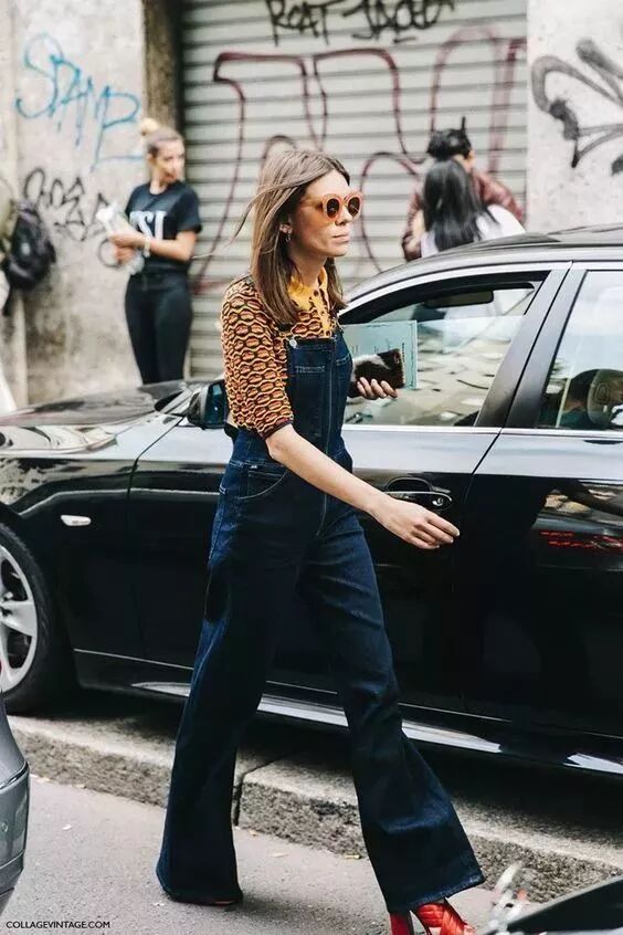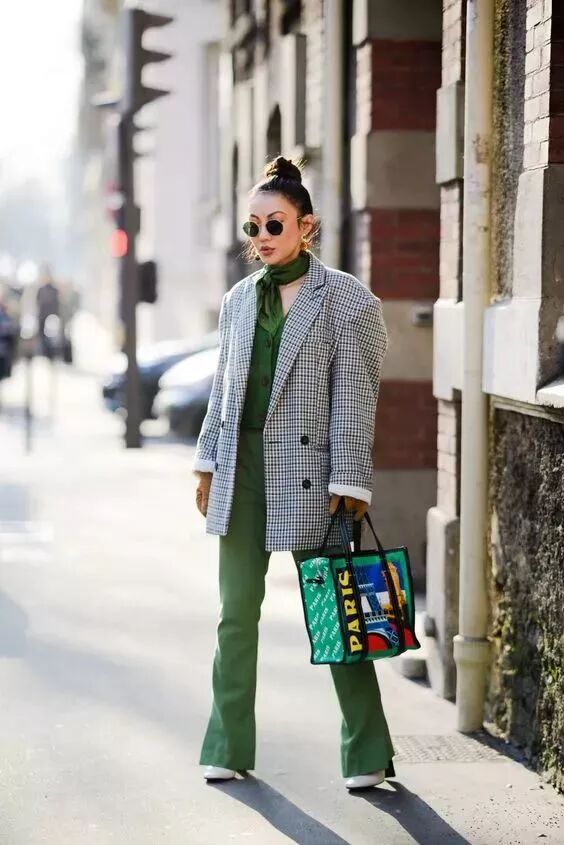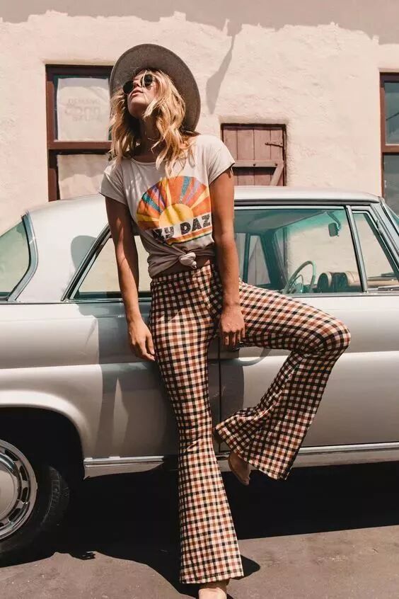 想要把喇叭裤穿出复古感,可以试试印花或者格纹元素,绝对让寡淡的纯色单品变得时髦有趣。